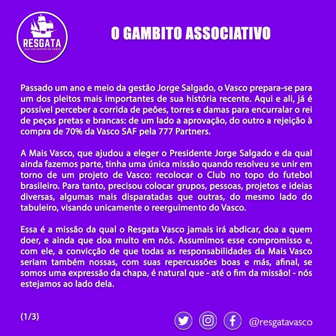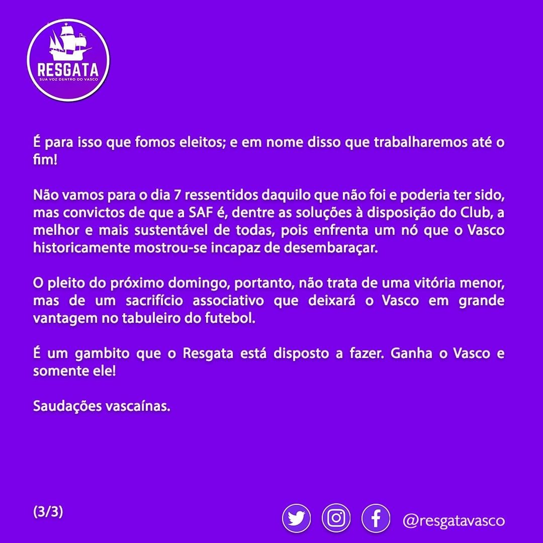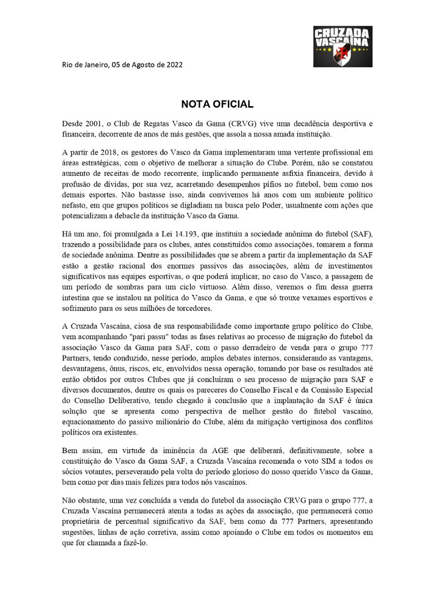 Cruzada Vascaína e Resgata Vasco se posicionam a favor da SAF