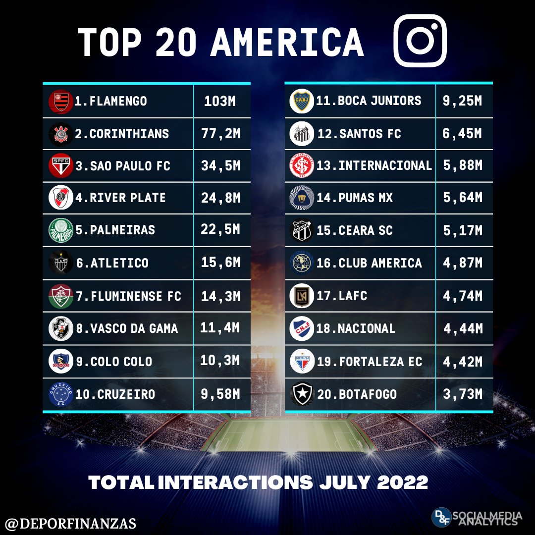 📲⚽¡Los 20 clubes de América con más interacciones en #instagram durante julio 2022!💙💬