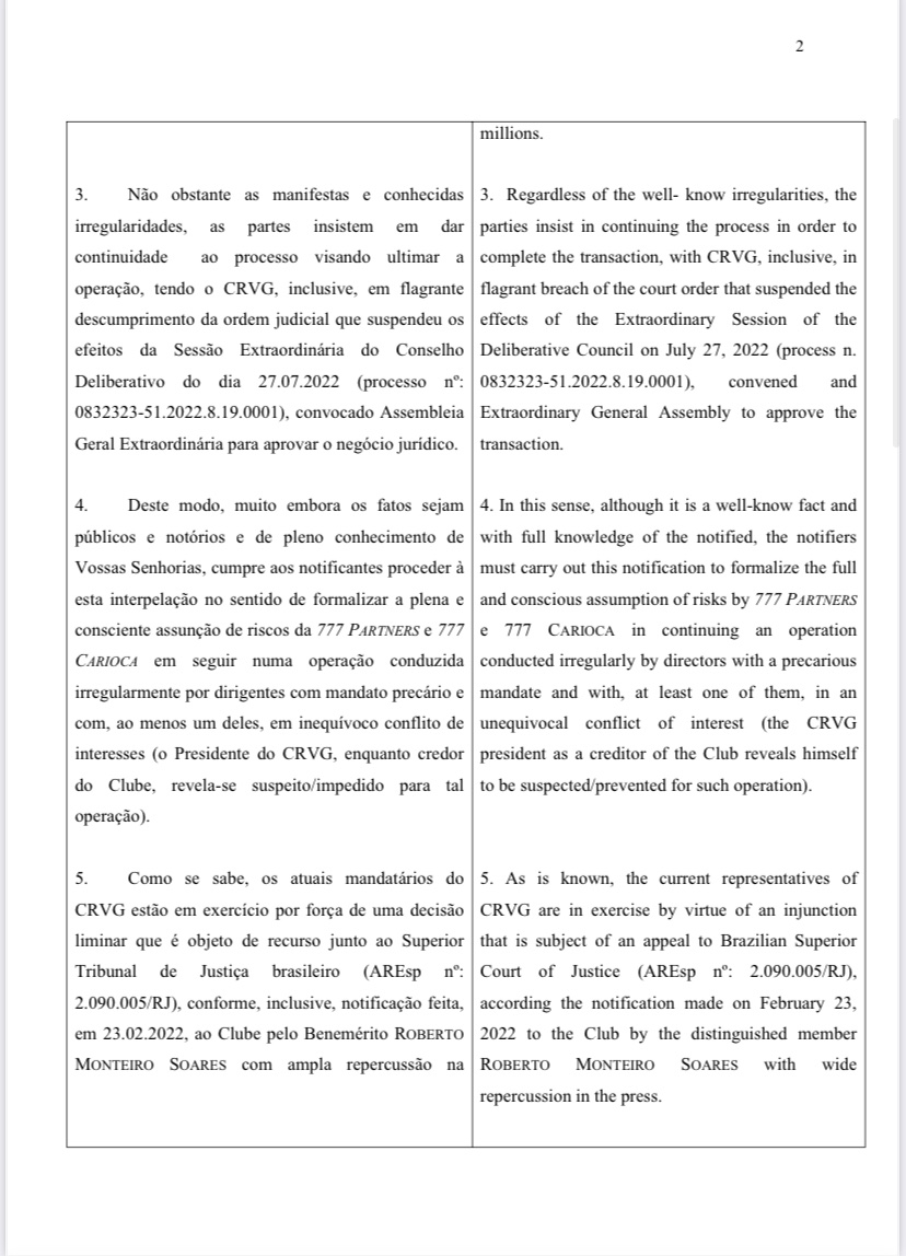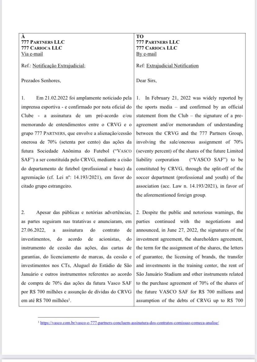 Leonardo Rodrigues e Márcio Magalhães, sócios e advogados, notificaram a 777 mostrando os riscos da empresa prosseguir no negócio q reputam viciado, irregular e temerário diante dos fatos públicos q ela tem conhecimento. É preservar o Vasco em caso de eventual anulação judicial.