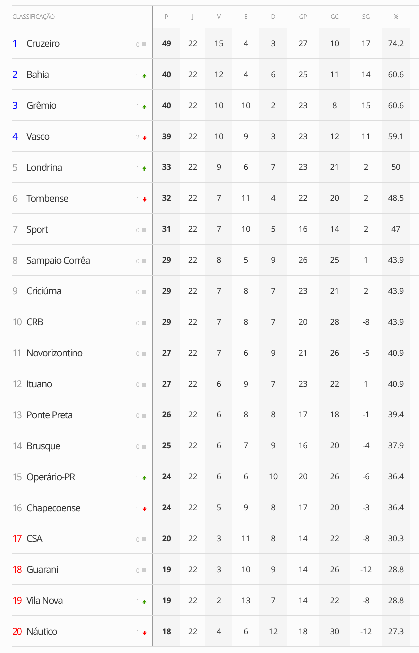Terminada a 22ª rodada do Brasileiro da Série B, o Vasco, que empatou com a Chapecoense por 0 a 0, caiu da 2ª para a 4ª colocação. O Gigante da Colina agora está a 10 pontos do líder, que é o Cruzeiro, e a 6 pontos do 5º colocado, que é o Londrina.