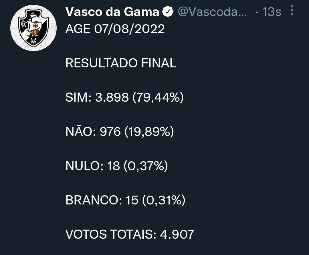 O sócio do Vasco da Gama tomou sua decisão e tornou o dia 7 de Agosto de 2022 um dia histórico na história de quase 124 anos do clube. A aprovação na Assembleia Geral Extraordinária deste domingo teve o Sim como vencedor com 79,44 % de votos a favor da venda de 70% da Vasco SAF para o grupo americano 777 Partners. 4907 sócios dos 6385 aptos a votar, exerceram sua opção: ou via celular ou presencialmente na Sede do Calabouço.