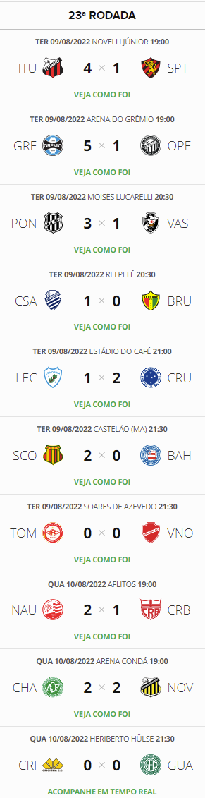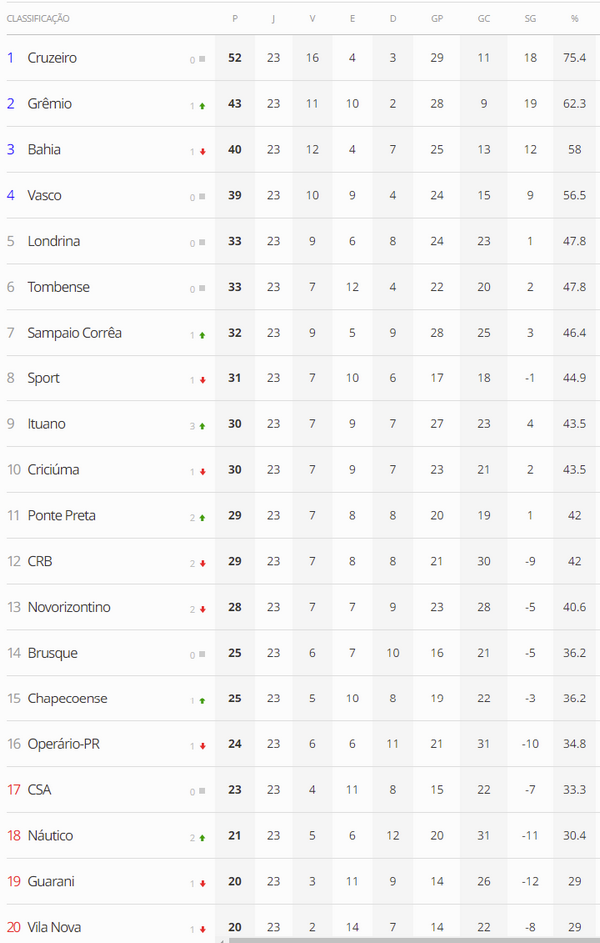 Terminada a 23ª rodada do Brasileiro da Série B, o Vasco, que perdeu para a Ponte Preta por 3 a 1, segue na 4ª colocação. O Gigante da Colina agora está a 13 pontos do líder, que é o Cruzeiro, e a 6 pontos do 5º colocado, que é o Londrina.