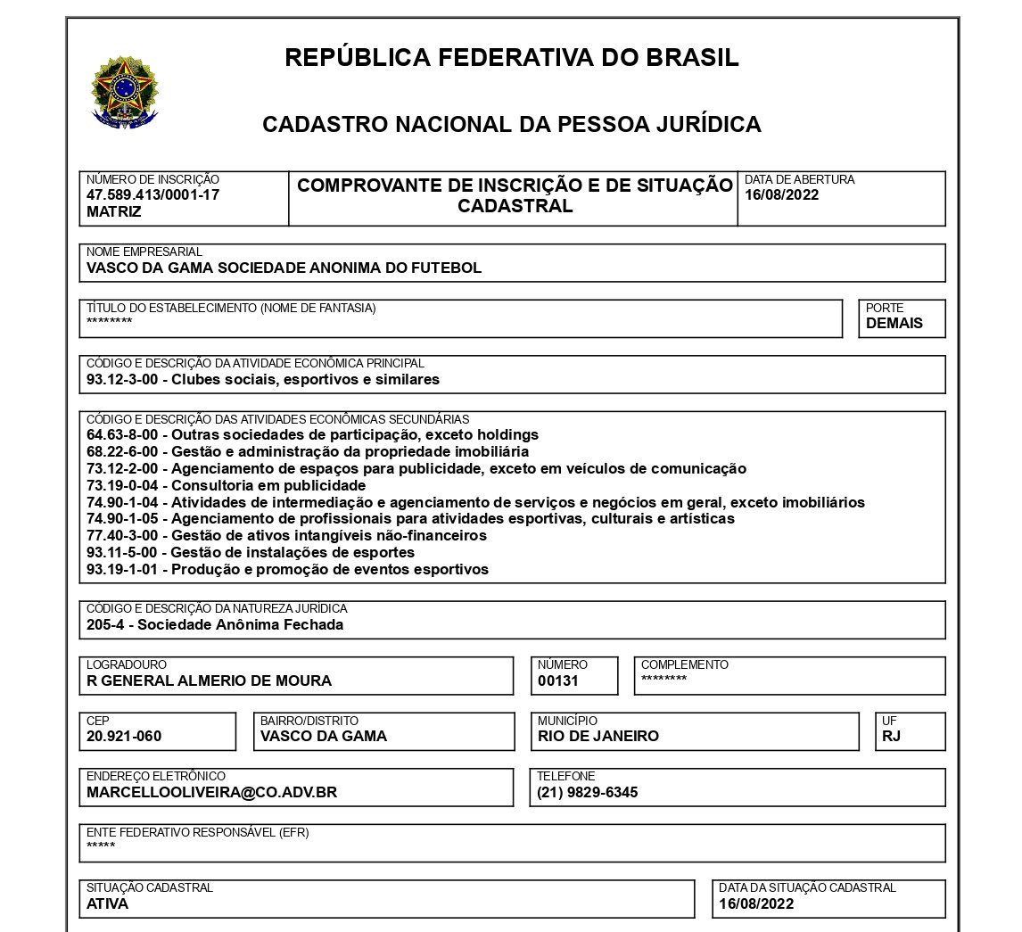 A informação da aprovação do CNPJ foi publicada inicialmente pelo jornalista Fábio Azevedo e, em seguida, confirmada pelo ge. Presidente do Conselho Regional de Contabilidade do Rio, o CRCRJ, usou as redes sociais no início da tarde desta terça para anunciar que "o Vasco da Gama SAF é uma realidade".