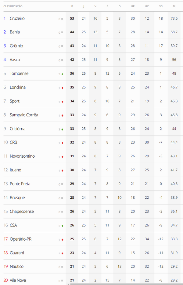 Veja a classificação da Série B após os jogos de 5ª-feira; Vasco está em 4º lugar