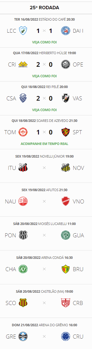 Dois jogos foram disputados nesta 5ª-feira pela 25ª rodada do Brasileiro da Série B. O Vasco, que perdeu para o CSA por 2 a 0 em Maceió, permanece em 4º lugar. O Gigante da Colina está a 11 pontos do líder e a 6 pontos do 5º colocado.