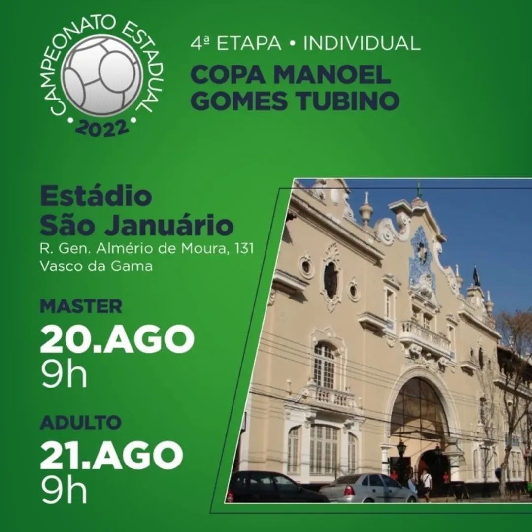 Neste fim de semana, dias 20 e 21 de agosto, terá prosseguimento o Campeonato Estadual Individual da modalidade 12 toques com a realização da quarta etapa - a Copa Manoel Gomes Tubino. A competição será na sala da Divisão de Futebol de Mesa do Vasco da Gama, no mezanino do ginásio principal do estádio de São Januário.