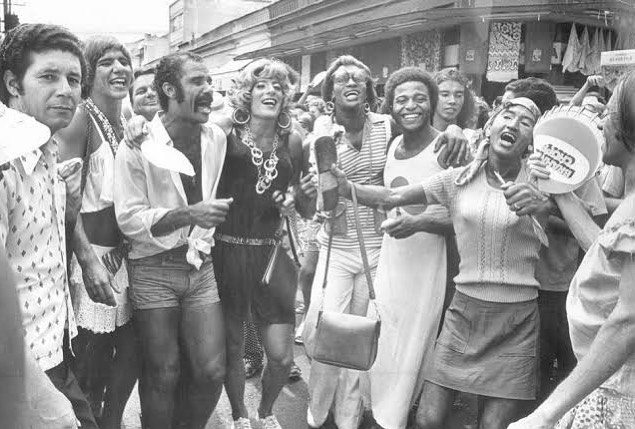 O Moisés é curiosamente o fundador do Bloco das Piranhas aqui no Rio. Eu não sabia disso, mas mostrei a camisa pro meu pai e ele lembrou. Fui pesquisar e é isso mesmo. Foto de 1973 com Joel Santana, de saia, Hércules Brito, Moisés, de preto, e Alcir Portela.
