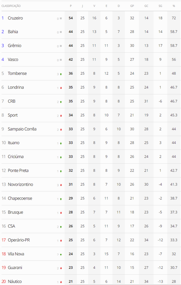 Terminada a 25ª rodada do Brasileiro da Série B, o Vasco, que perdeu para o CSA por 2 a 0, se manteve na 4ª colocação. O Gigante da Colina agora está a 12 pontos do líder, que é o Cruzeiro, e a 6 pontos do 5º colocado, que é o Tombense.
