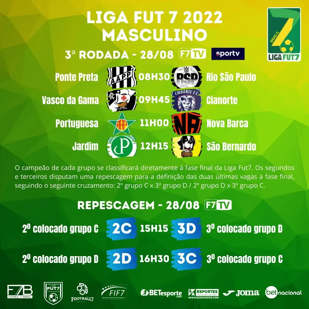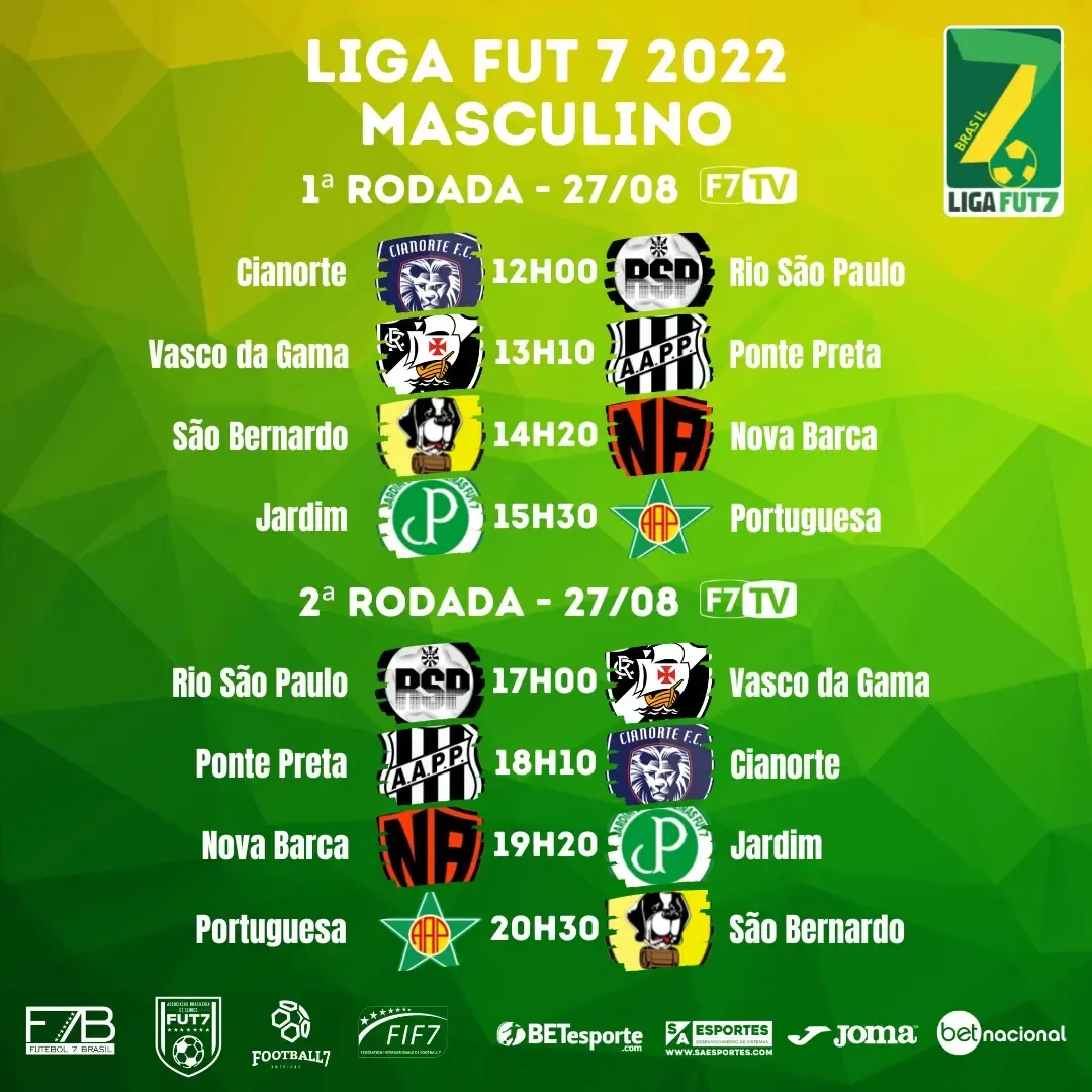 Confira a tabela completa da segunda etapa da Liga Fut7, que será no próximo final de semana, no Rio de Janeiro.