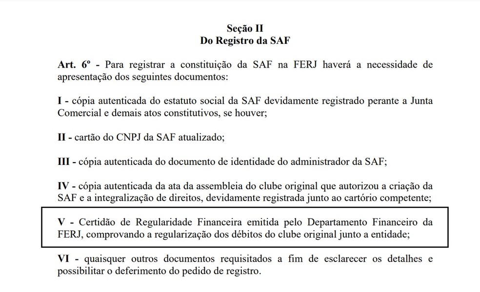 A decisão cumpre o que aconteceu também no processo de registro do Botafogo e vai de encontro ao que está descrito no regulamento da Ferj para registro da SAF. O artigo 8º do documento diz o seguinte: