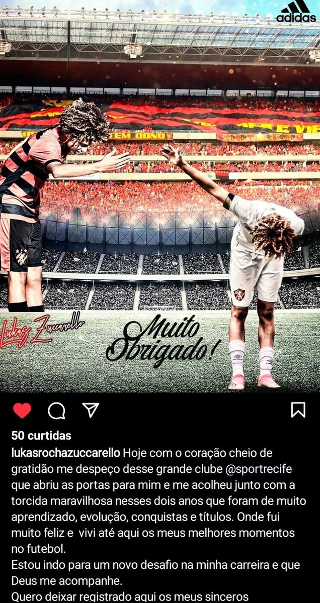 Lukas Zuccarello se despediu do Sport pelo Instagram. A jovem promessa de 15 anos está vindo para o Vasco.
