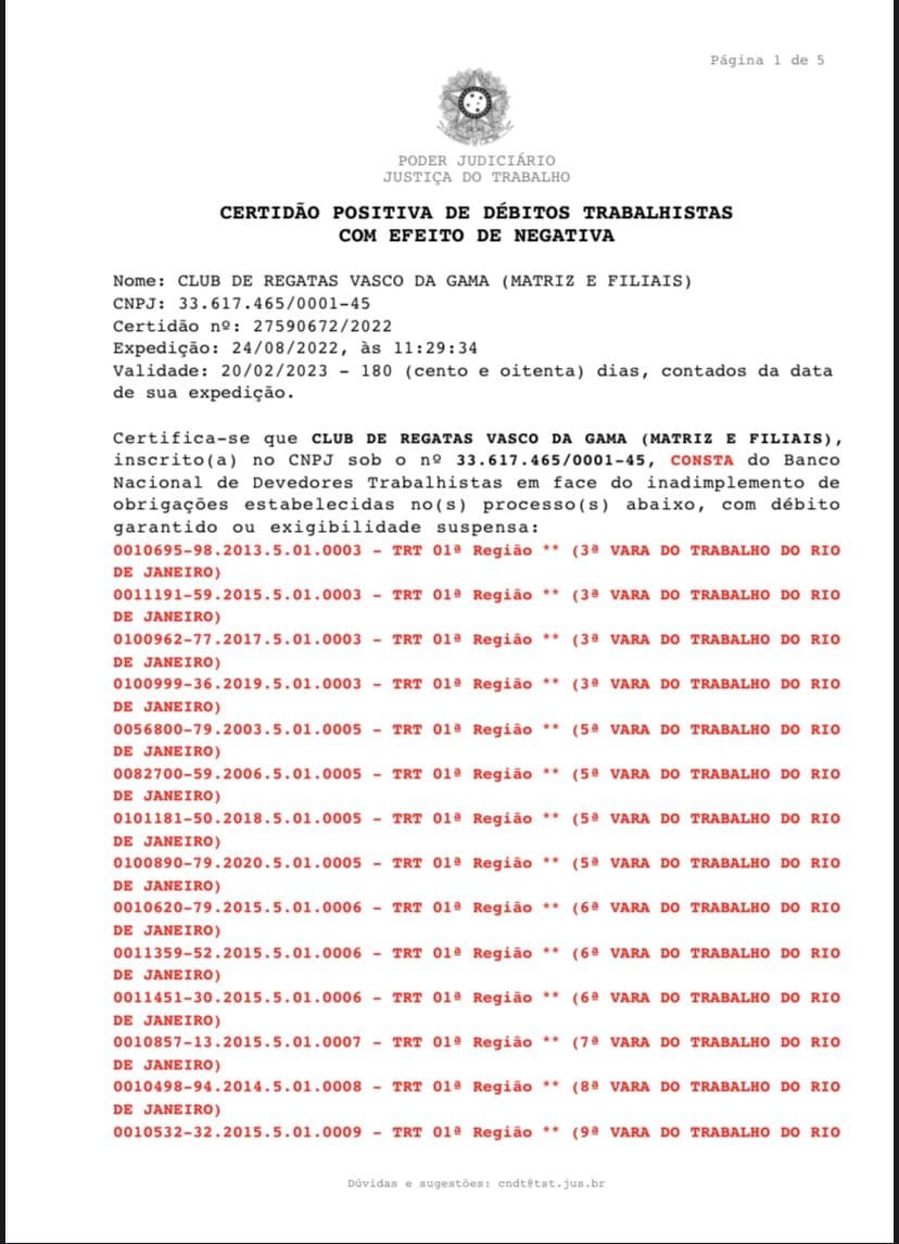 O @VascodaGama conseguiu a certidão positiva com efeitos de negativa de débitos trabalhistas.