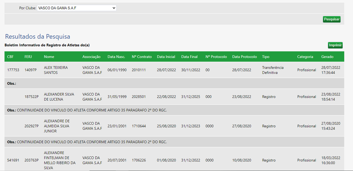 A SAF do Vasco já consta no site da federação, que emitiu uma Resolução da Presidência logo após o fim da reunião realizada na tarde desta quarta, na sede da entidade, deferindo o pedido de registro do clube.
