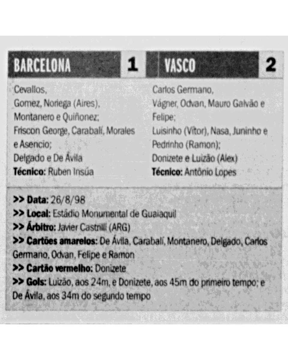 Com o famoso "gol do Juninho, no Monumental", o Vasco bateu os poderosos argentinos e carimbou passaporte para a grande decisão. No primeiro jogo da final contra o Barcelona-EQU, em São Januário com mais de 36 mil pessoas, vitória cruzmaltina por 2 a 0, gols de Luizão e Donizete.
