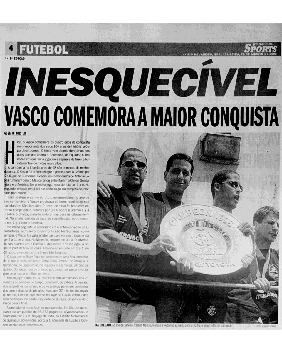 Veja reportagem do 'Jornal dos Sports' sobre o título do Vasco da Libertadores de 1998