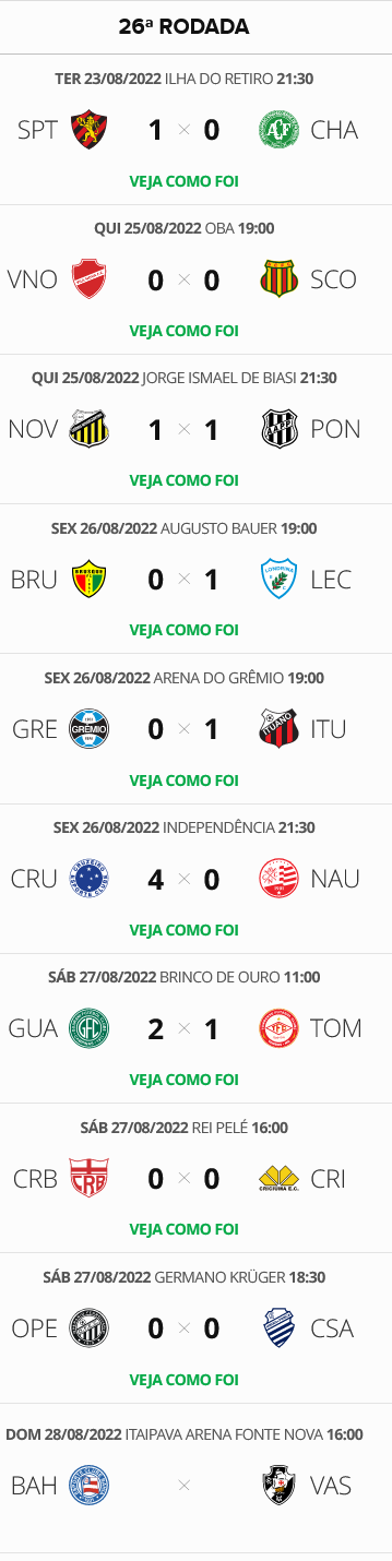 Três jogos foram disputados neste sábado pela 26ª rodada do Brasileiro da Série B. Em 4º lugar, o Vasco está a 15 pontos do líder e a 4 pontos do 5º colocado. Bahia x Vasco, neste domingo, fechará a rodada.