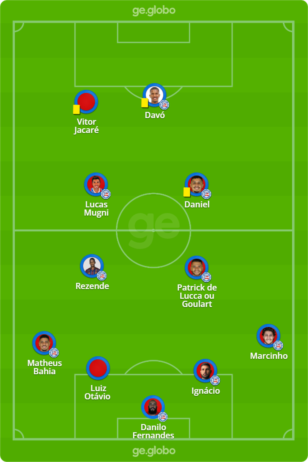 O time provável do Bahia para logo mais tem: Danilo Fernandes, Marcinho, Ignácio, Luiz Otávio e Matheus Bahia; Rezende, Mugni, Patrick de Lucca (Ricardo Goulart) e Daniel; Jacaré e Davó;