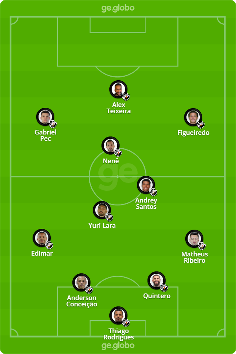 O time provável do Vasco para logo mais tem: Thiago Rodrigues, Matheus Ribeiro, Quintero, Anderson Conceição, Edimar, Yuri Lara, Andrey Santos, Nenê, Figueiredo, Gabriel Pec (Bruno Tubarão) e Alex Teixeira.