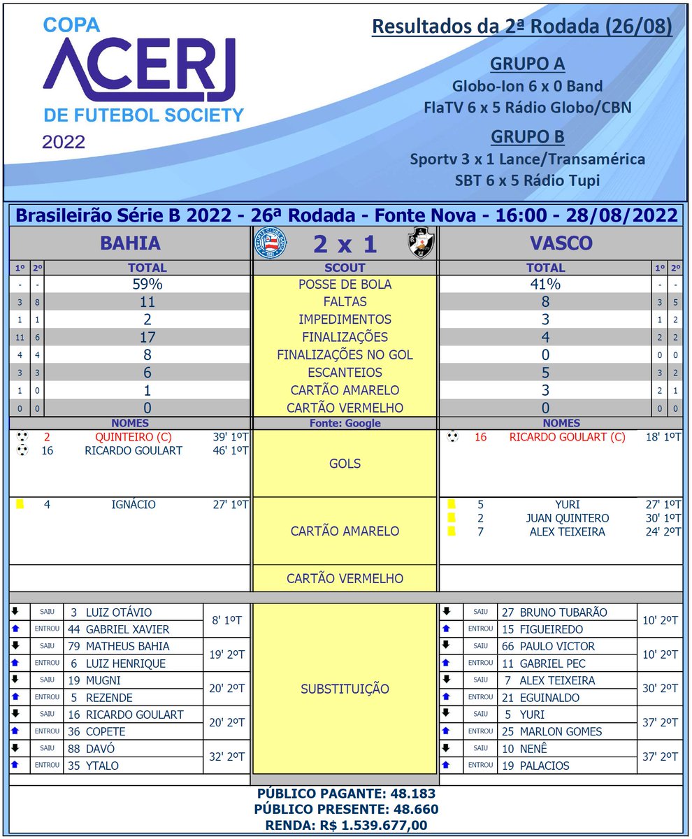 Cartões amarelos: Ignácio (Bahia); Yuri, Alex Teixeira e Quintero (Vasco)