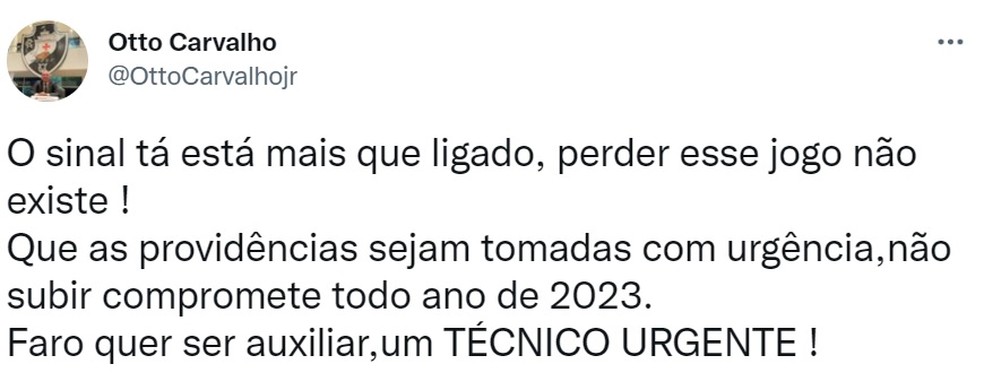 - O sinal está mais que ligado, perder esse jogo não existe ! Que as providências sejam tomadas com urgência, não subir compromete todo ano de 2023. Faro quer ser auxiliar, um técnico urgente - escreveu Otto Carvalho em seu perfil no Twitter.