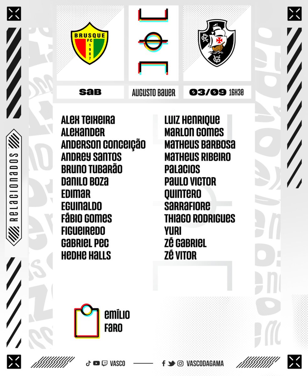 Confira os relacionados do Vasco para o jogo contra o Brusque; Nenê e Raniel são desfalques