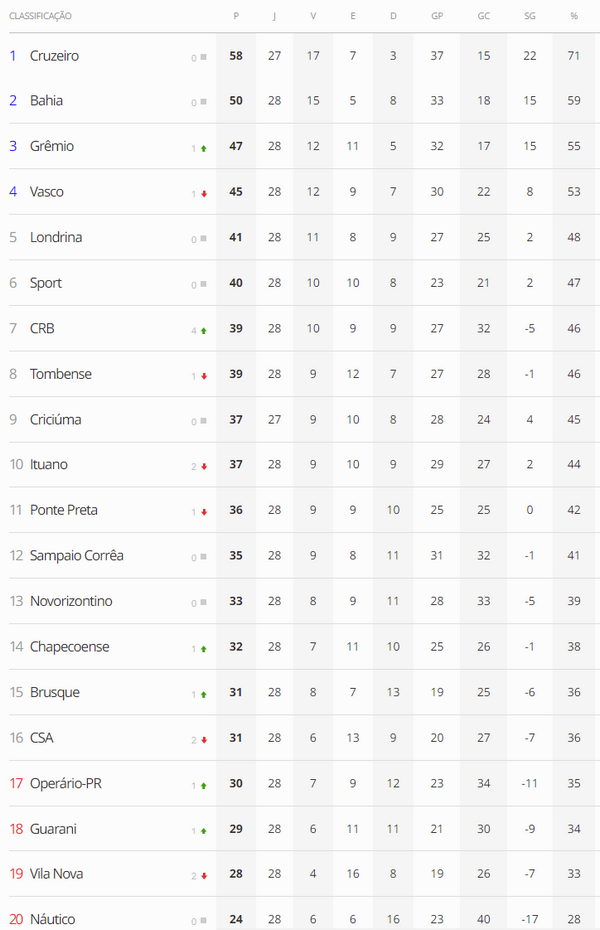 O Vasco, que perdeu para o Brusque por 1 a 0, terminará a 28ª rodada do Brasileiro da Série B a 4 pontos do 5º colocado, atualmente o Londrina, que também foi derrotado. O jogo deste domingo entre Cruzeiro e Criciúma não influenciará na posição do Vasco na classificação da Série B.