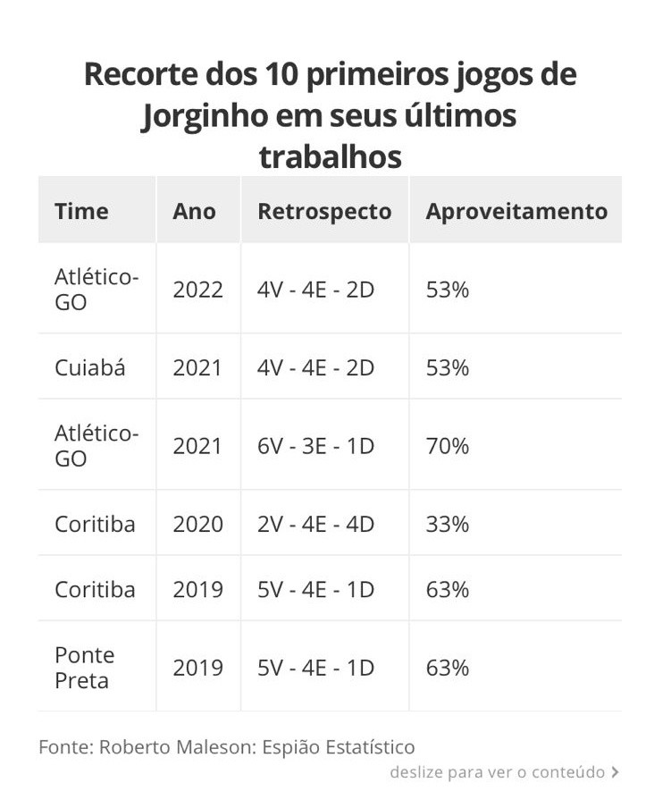 Veja como foram os 10 primeiros jogos nos últimos trabalhos de Jorginho como técnico