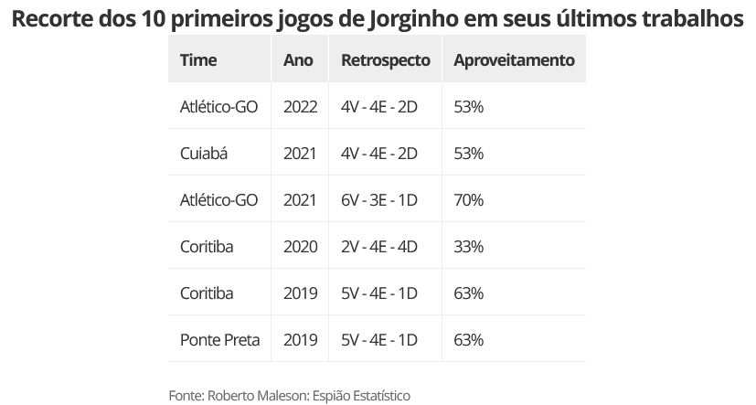 Com passagens pelo Vasco em 2016 e 2018, Jorginho comandou seis trabalhos desde 2019. Nesse período até aqui, ele teve um aproveitamento maior que 50% nos dez primeiros jogos no comando das equipes que treinou - com exceção do Coritiba, em 2020. Veja abaixo o recorte na tabela: