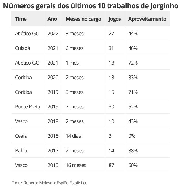 Nos últimos 10 trabalhos de Jorginho, o treinador teve mais sucesso no Vasco, na passagem em 2015 e 2016 pelo clube, quando conquistou o Campeonato Carioca e o acesso para a Série A. Depois, o máximo que conseguiu foi ficar sete meses no comando da Ponte Preta, em 2019. O último clube que treinou foi o Atlético-GO, levando o time até as semifinais da Sul-Americana.