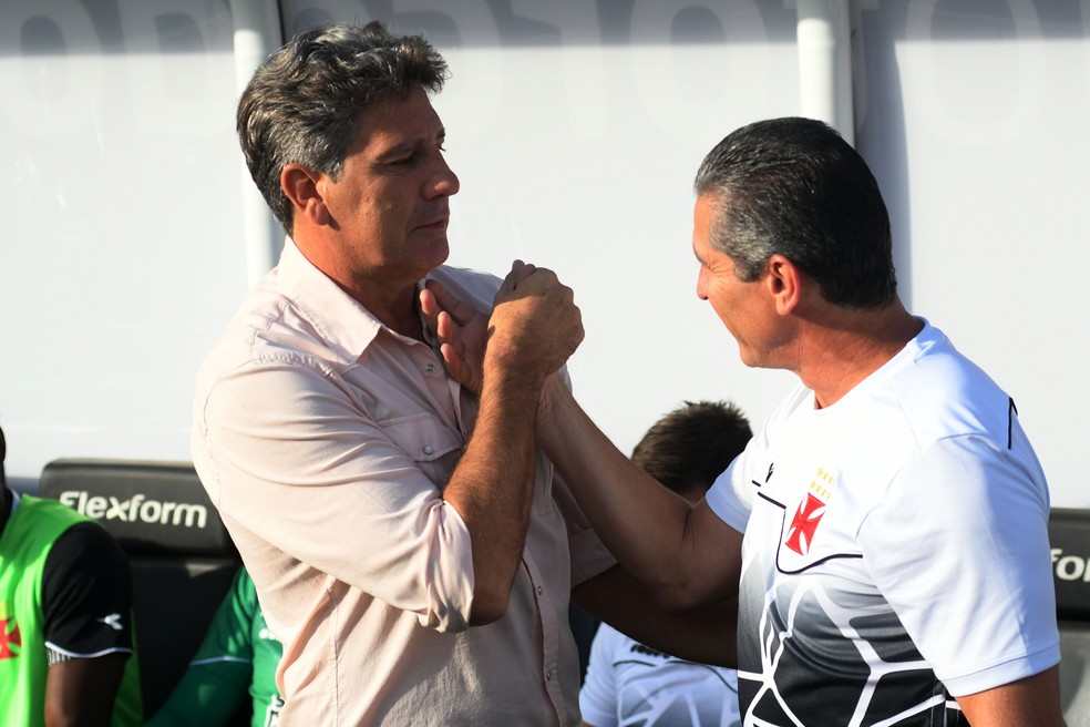 Muitas coincidências marcam o encontro entre Renato Portaluppi e Jorginho, neste domingo, em Grêmio x Vasco. Os dois foram contratados respectivamente para levar os clubes ao acesso, comandaram o primeiro treino na terça e estreiam no domingo em clubes que já tiveram – guardadas as devidas proporções – sucesso como jogador e treinador.
