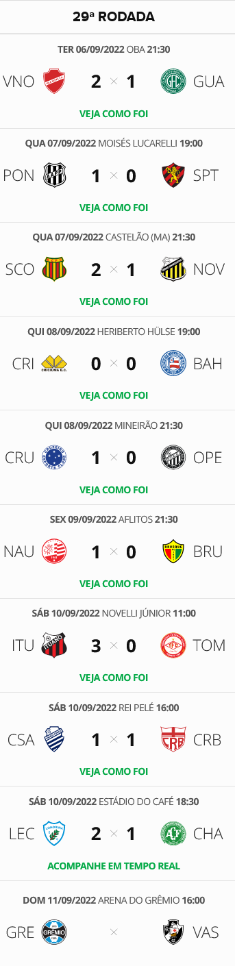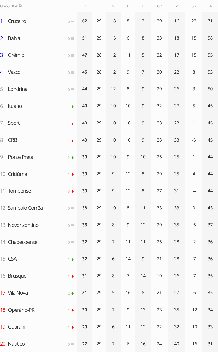 Três jogos foram disputados neste sábado pela 29ª rodada do Brasileiro da Série B. O Vasco permanece em 4º lugar. O Gigante da Colina está a 17 pontos do líder e a 1 ponto do 5º colocado. Caso o Vasco vença o Grêmio neste domingo, ultrapassará o time gaúcho e terminará a rodada na 3ª colocação.