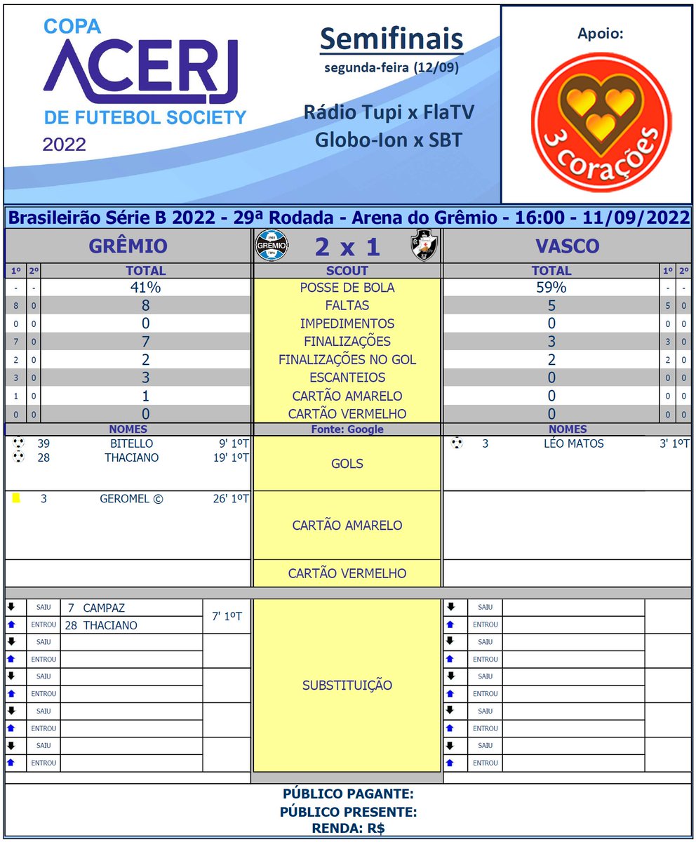 Scout do 1º Tempo de Grêmio e Vasco pela 29ª Rodada do Campeonato Brasileiro da Serie B 2022 na Arena do Grêmio (Fonte: Google) #Acerjinforma #BrasileiraoSerieB #GRExVAS #Gremio #Vasco @BrasileiraoB @Gremio @VascodaGama