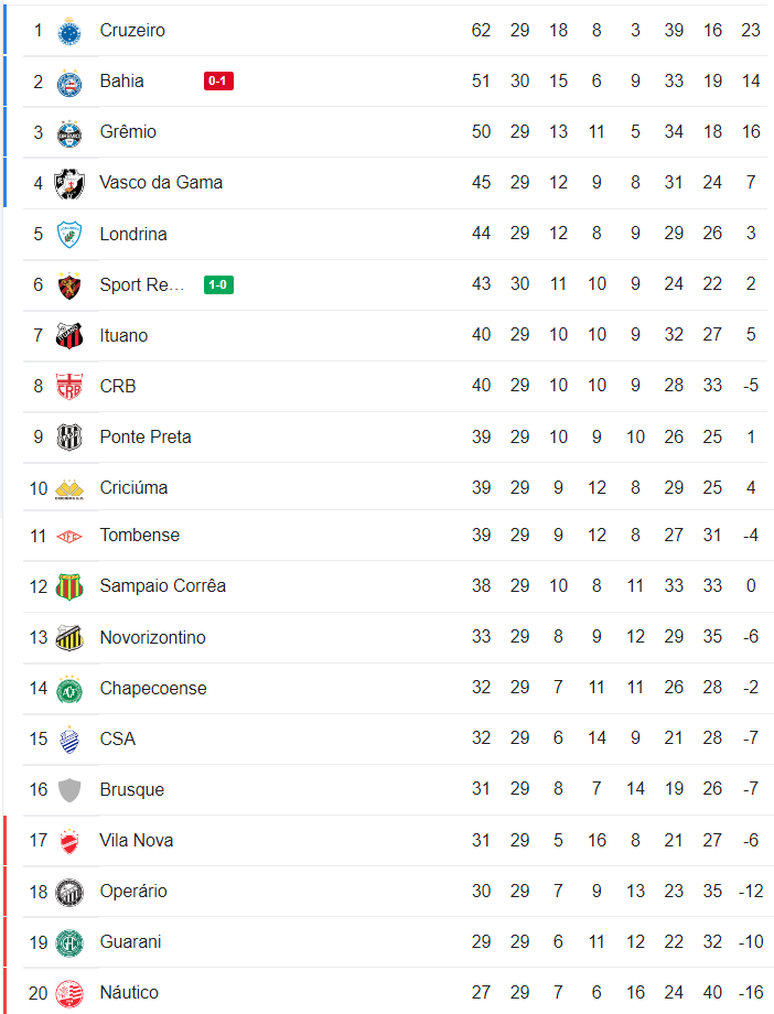 Na abertura da 30ª rodada do Brasileiro da Série B, o Sport derrotou o Bahia por 1 a 0 na noite desta 2ª-feira em Recife. O time pernambucano chegou a 43 pontos, subiu da 7ª para a 6ª colocação e ficou 2 pontos atrás do Vasco. O Gigante da Colina volta da campo na 6ª-feira, às 19h, contra o Náutico, em São Januário.