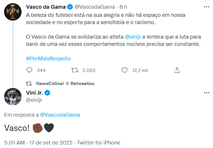 Vinícius Júnior agradece mensagem de solidariedade do Vasco
