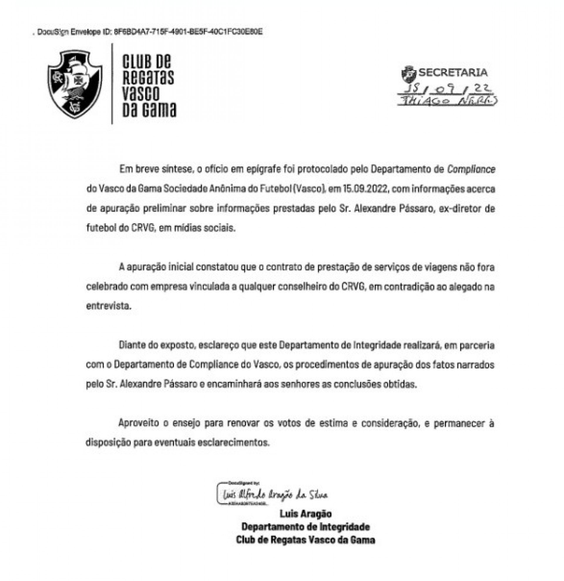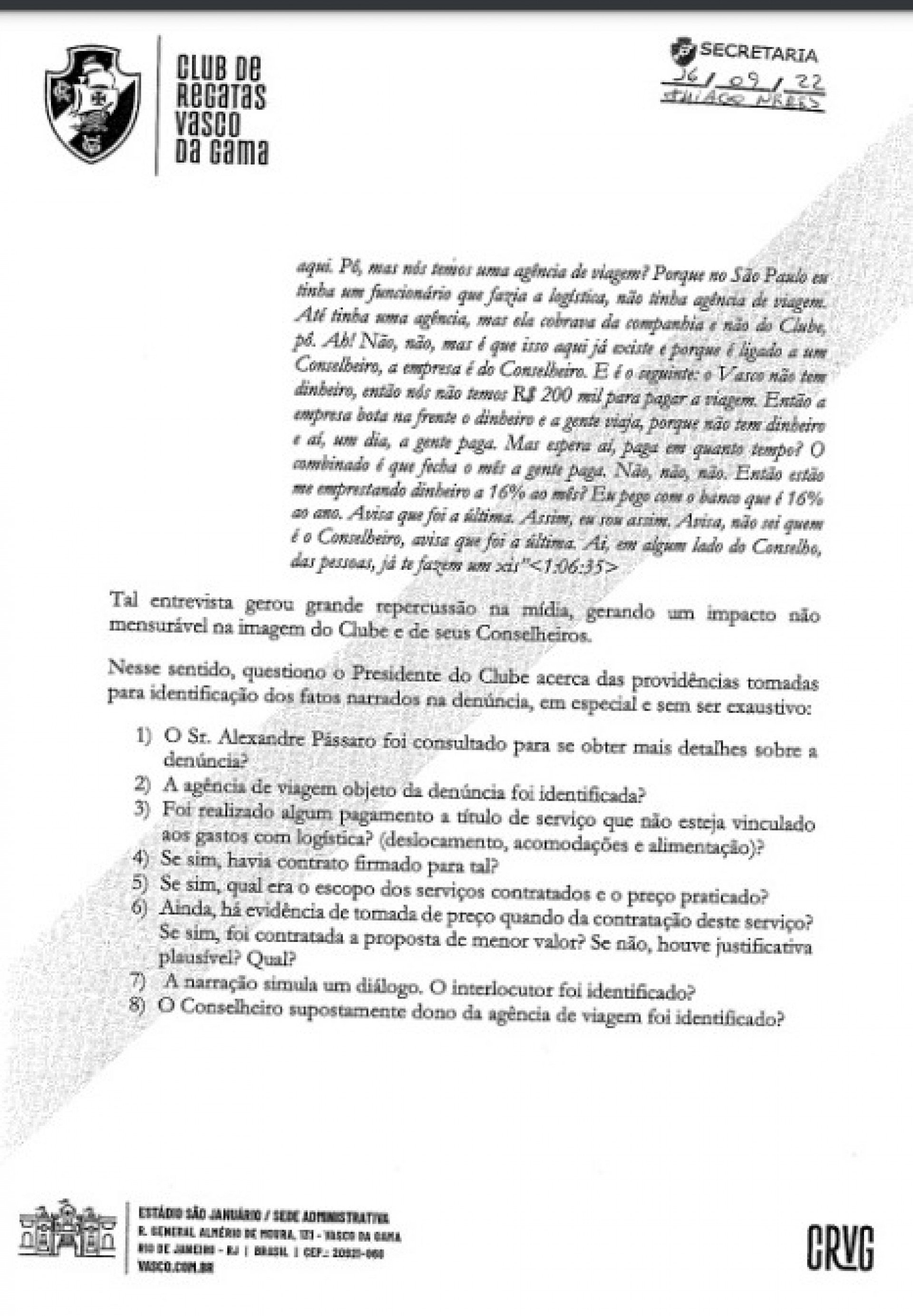 As declarações do ex-diretor de futebol do Vasco, Alexandre Pássaro, seguem repercutindo dentro do clube. Na última sexta-feira, o presidente do Conselho Deliberativo, Carlos Fonseca, protocolou um ofício na secretaria cobrando providências do presidente Jorge Salgado, alegando que "tal entrevista gerou grande repercussão na mídia, gerando impacto não mensurável na imagem do Clube e de seus Conselheiros".