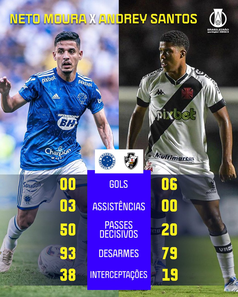 Veja comparação entre números de Neto Moura e Andrey Santos na Série B 2022