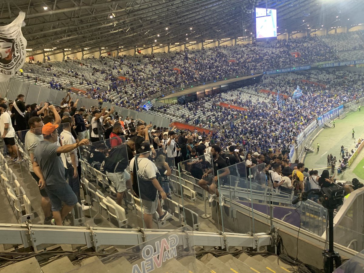 Setor visitante fica aqui bem ao lado da imprensa. Vascaínos cantam alto enquanto goleiros sobem pro aquecimento #trmineirao