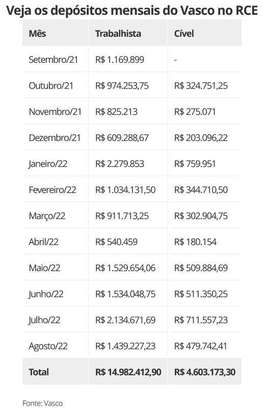 No total, de acordo com a última atualização nos autos, o Vasco já transferiu R$ 19.585.313,20 para as contas judiciais do RCE, que por sua vez é desmembrado em dois processos: um no Tribunal de Justiça, que centraliza as dívidas de natureza cível, e outro na Justiça do Trabalho, que lida com as de natureza trabalhista.