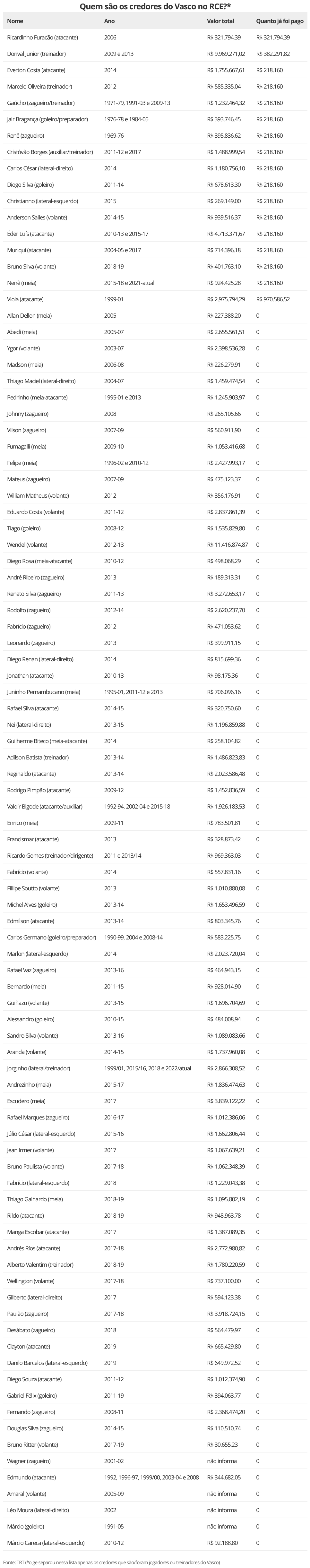 Juninho Pernambucano (R$ 706.096,16), Felipe Maestro (R$ 2.427.993,17), Pedrinho (R$ 1.245.903.97) e Carlos Germano (R$ 583.225,75) também estão entre os credores. A maior dívida que consta no RCE é a que o Vasco tem com o ex-volante Wendel, que defendeu a equipe entre 2012 e 2013: R$ 11.416.874,87.