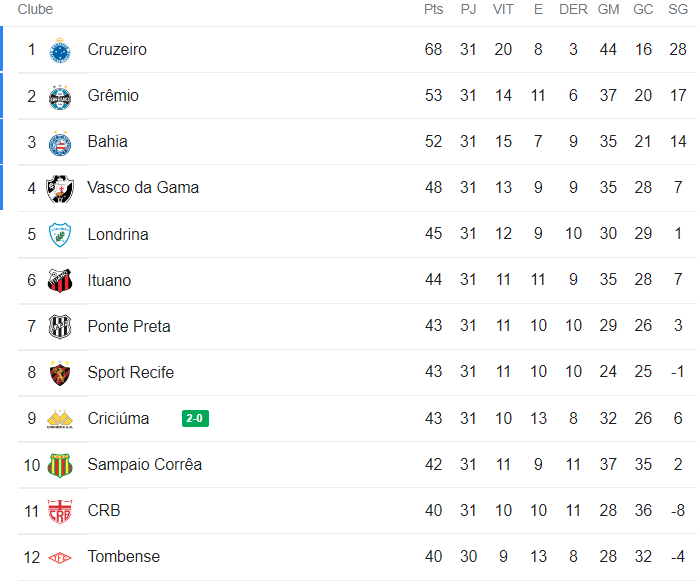 A 31ª rodada do Brasileiro da Série B teve apenas um jogo neste domingo. O Criciúma, em casa, venceu a Chapecoense por 2 a 0 e chegou aos 43 pontos, passando a ficar 5 pontos atrás do Vasco. A partida CSA x Tombense, na 2ª-feira, encerra a rodada. O Gigante da Colina está em 4º lugar, ou seja, dentro do G4, a 3 pontos do 5º colocado, que é o Londrina, que é justamente seu próximo adversário, na 5ª-feira, em São Januário.