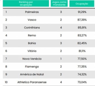 O Vasco foi o segundo clube do futebol brasileiro com maior taxa de ocupação do seu estádio (87,39%) no mês de agosto, apenas atrás do Palmeiras (91,29%). Os dados são de um relatório da Pluri Consultoria e foram publicados pelo site Lance.