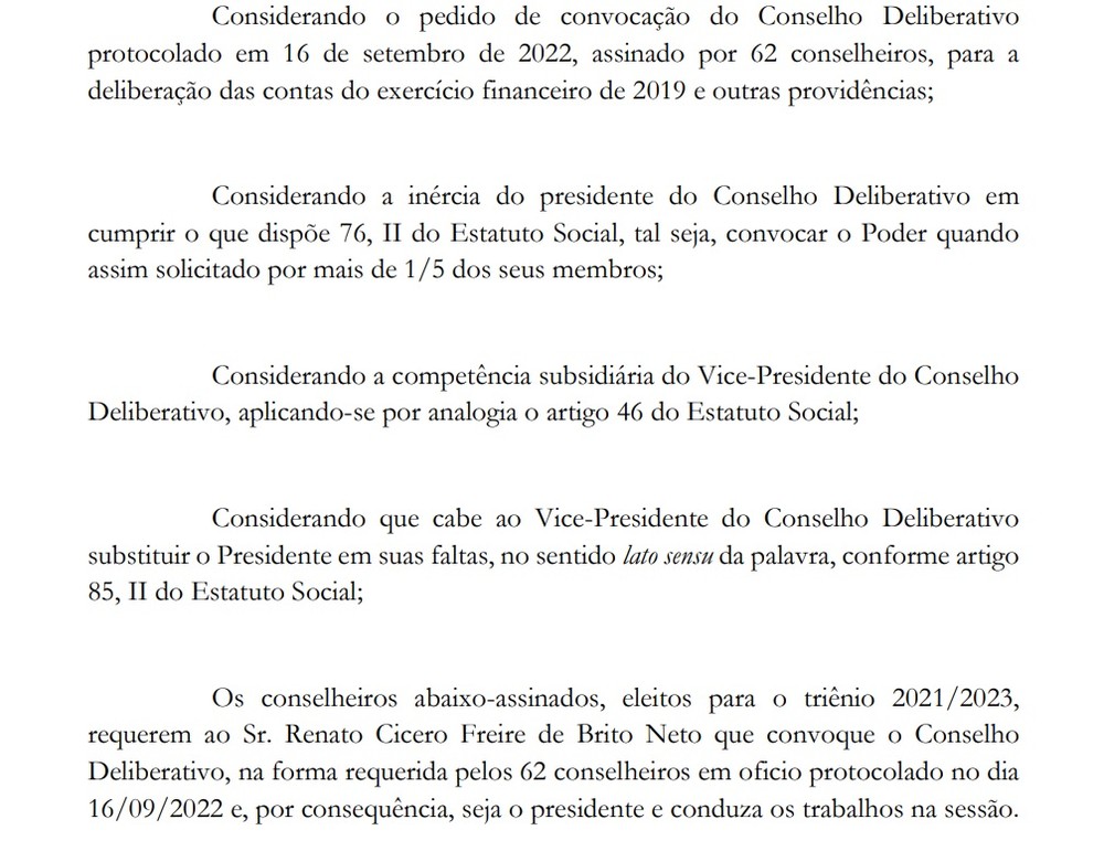 Nesta sexta, inclusive, um documento assinado por 32 conselheiros foi protocolado na secretaria do clube direcionado ao vice-presidente do Conselho Deliberativo, Renato Cicero Freire de Brito Neto, pedindo para que ele convocasse a reunião. Os conselheiros ameaçaram ir à Justiça caso a data não fosse marcada.
