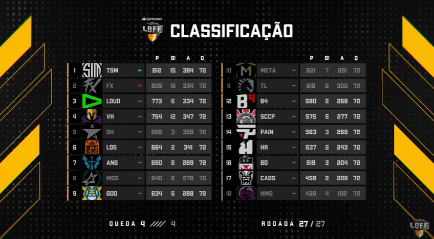 A BD Vasco termina a rodada 27 na décima sexta colocação com 519 pontos e se despede da Liga Brasileira de Free Fire nessa season.