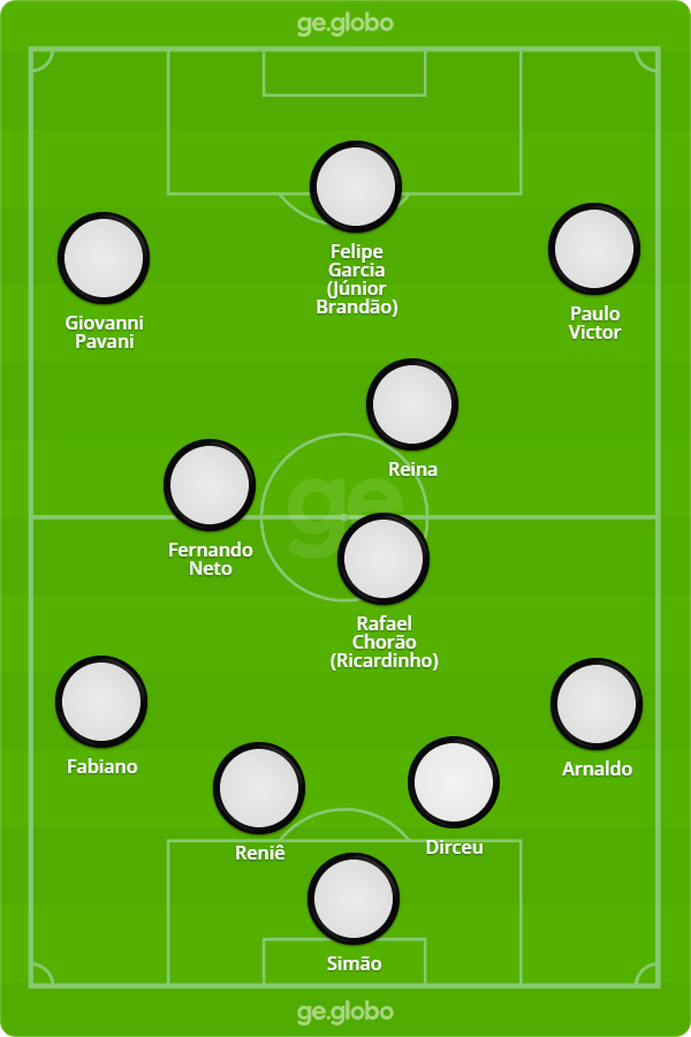 Provável time: Simão; Arnaldo, Dirceu, Reniê e Fabiano; Rafael Chorão (Ricardinho), Fernando Neto e Reina; Giovanni Pavani, Paulo Victor e Felipe Garcia.
