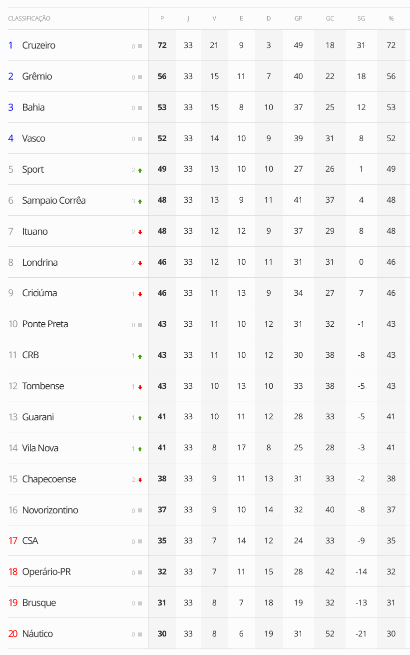 Terminada a 33ª rodada do Brasileiro da Série B, o Vasco, que venceu o Operário por 3 a 2, se manteve na 4ª colocação. A distância para o 5º colocado, que agora é o Sport, subiu de 2 para 3 pontos.