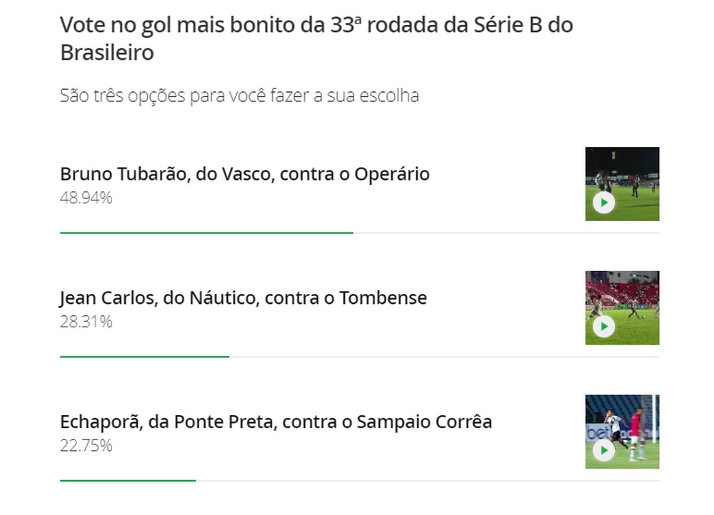 O atacante Bruno Tubarão, do Vasco, venceu a enquete do gol mais bonito da 33ª rodada da Série B do Brasileiro com 48,94% dos votos.