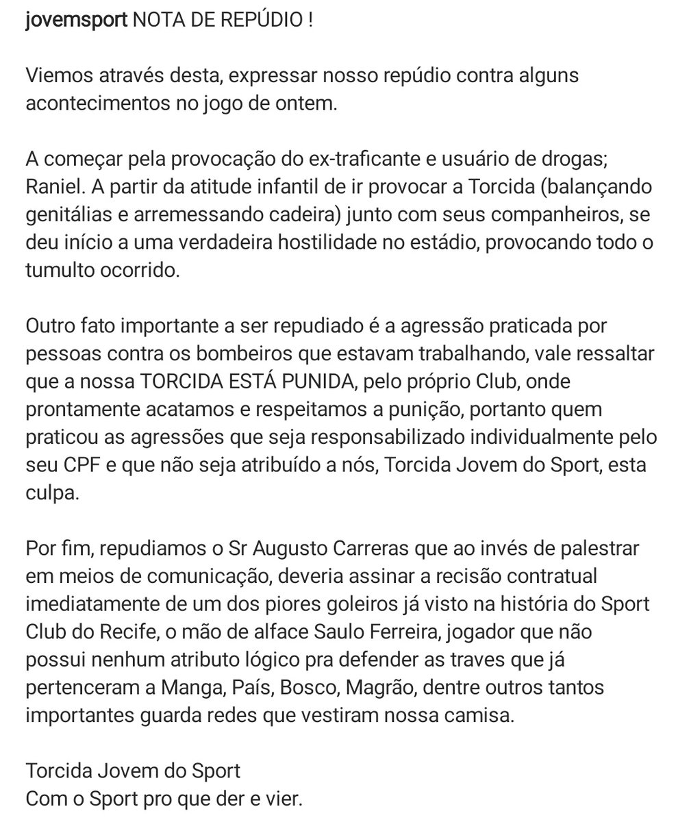 A Torcida Jovem do Sport, maior organizada dos pernambucanos, emitiu uma ‘nota oficial' chamando Raniel de ex-traficante e usuário de drogas. Que postura minúscula!