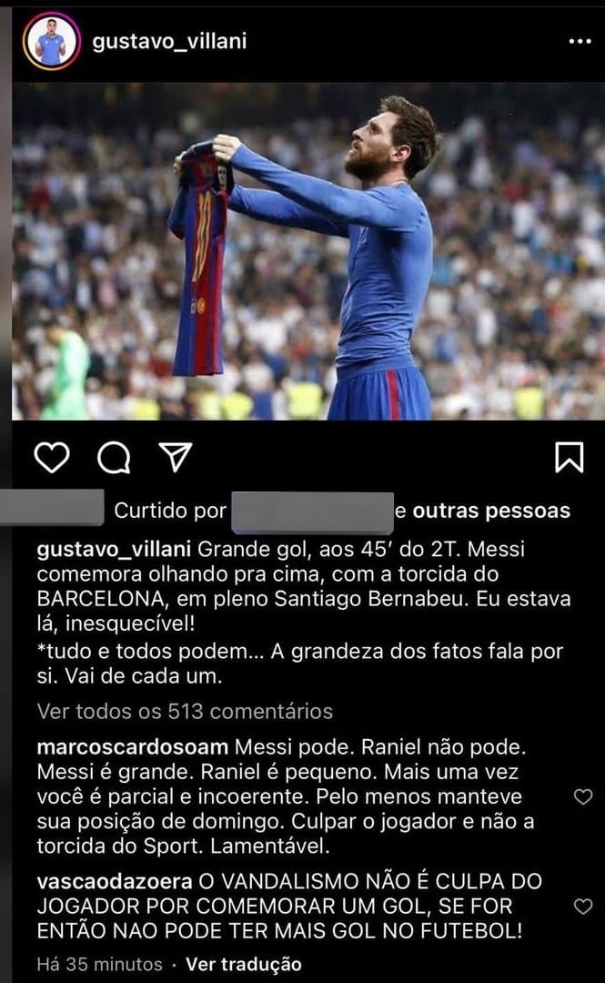 "Mas quando o Messi mostrou a camisa para a torcida do Real no Bernabéu o Villani achou lindo", opinou um outro usuário sobre o assunto.