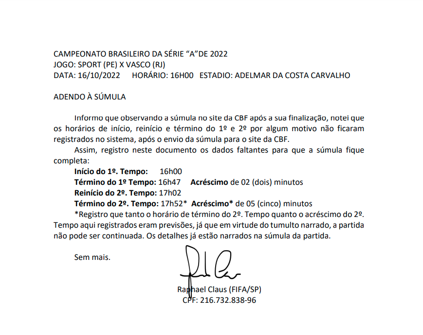 Raphael Claus retifica súmula de Sport 1 x 1 Vasco em relação aos horários de início e fim de cada tempo