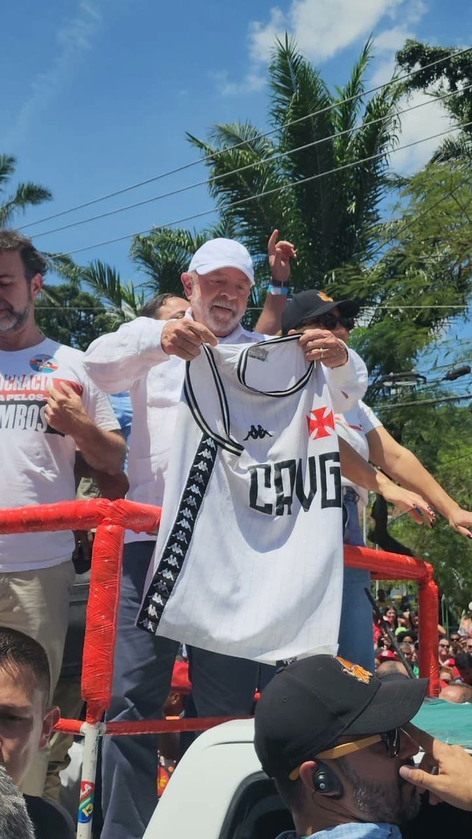 Candidato e ex-presidente Lula recebeu uma camisa do Vasco em sua caminhada de hoje em São Gonçalo, Rio de Janeiro.